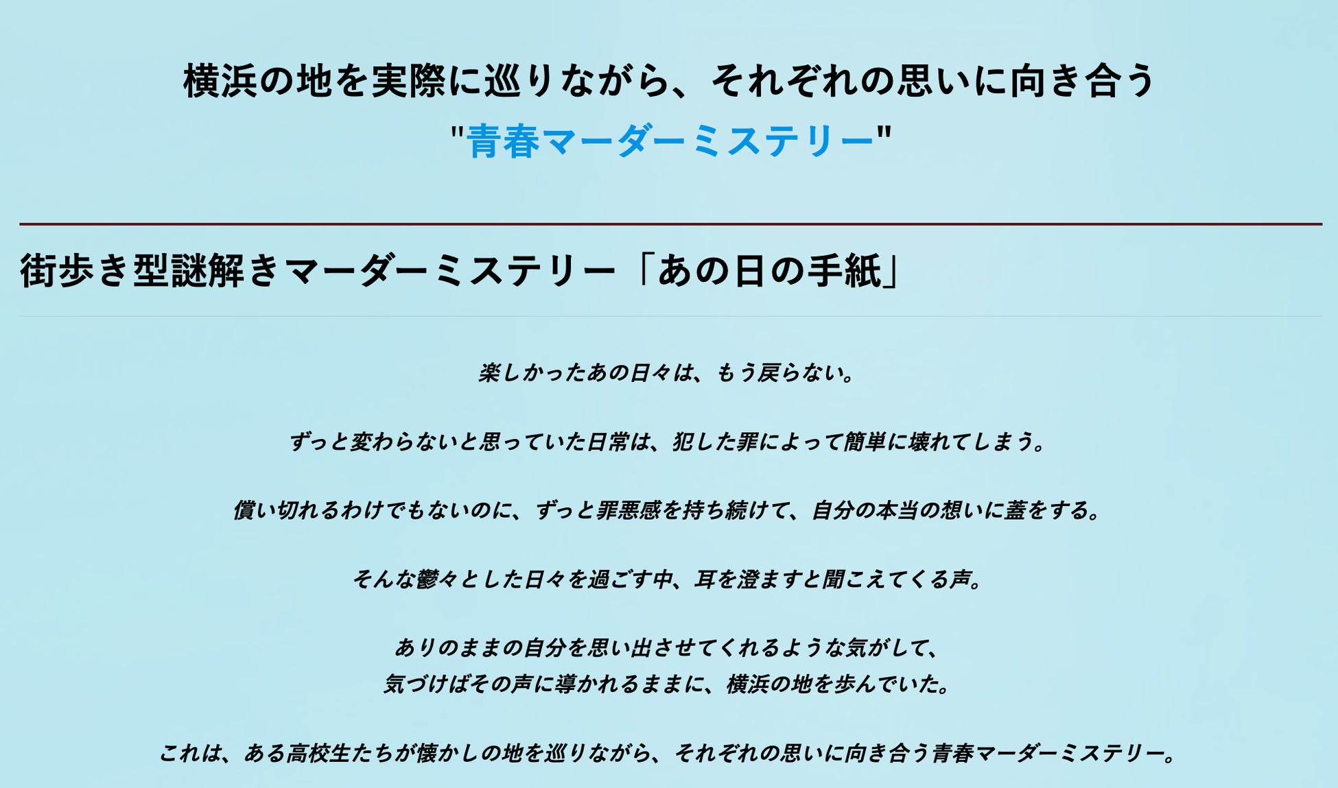 『あの日の手紙』は、横浜の街を実際に巡りながら謎を解き明かす周遊型で、高校生の桜木神奈と横溝健太となって、友達の事故の謎に挑む。