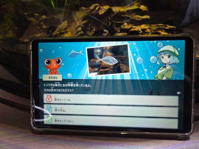 専用タブレットを使い、海中探検隊の新米探検生となって、水族館内に潜む『未知のサカナ』の調査を行います。