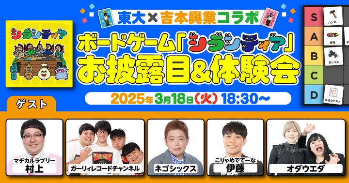 吉本興業と東京大学による「笑う東大、学ぶ吉本プロジェクト」の一環として開発されたオリジナルボードゲーム「シランティア」のお披露目&体験会が、2025年3月18日(火)にJELLY JELLY CAFE池袋2号店で開催されます。
