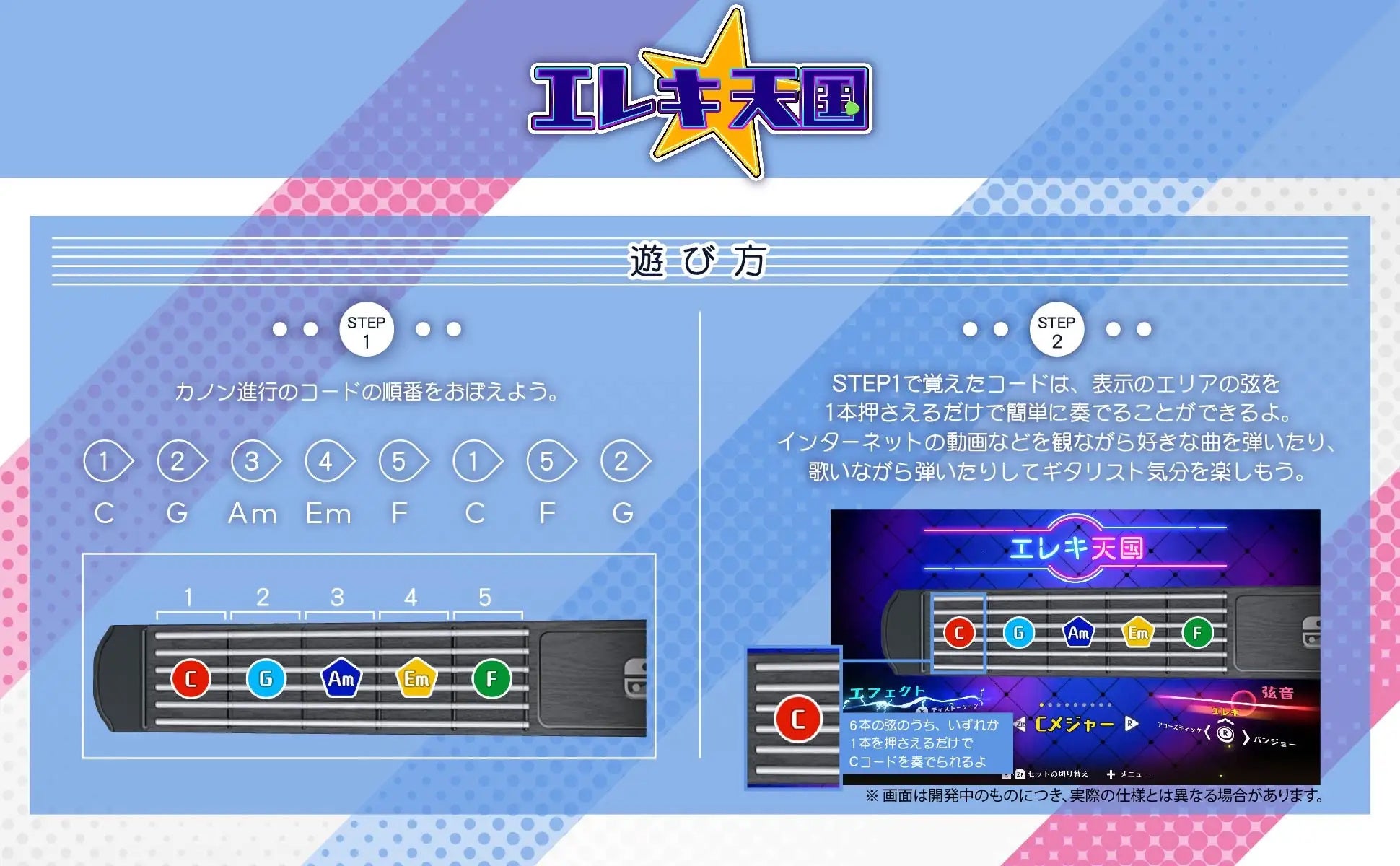 前者は簡単なコード進行で多くの曲を演奏可能に、後者はリズムゲームでリズム感を養えるモードです。