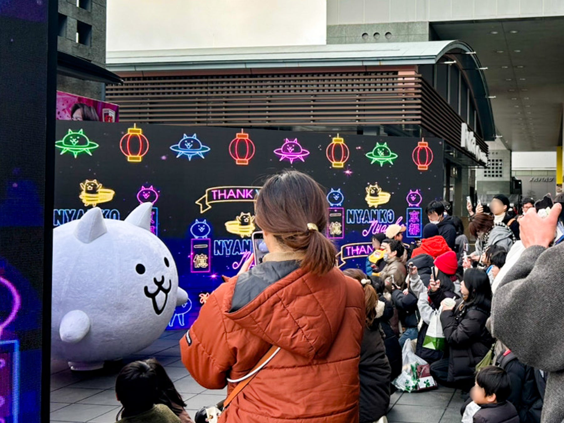 ポノス株式会社は、スマートフォン向けゲームアプリ『にゃんこ大戦争』の1億ダウンロード突破を記念し、2025年2月22日から28日まで京都駅ビル駅前広場でイベントを開催しました。