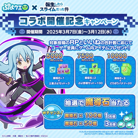 セガは、スマホ向けパズルRPG『ぷよぷよ!!クエスト』において、TVアニメ『転生したらスライムだった件』とのコラボイベントを2025年3月14日より開催すると発表しました。