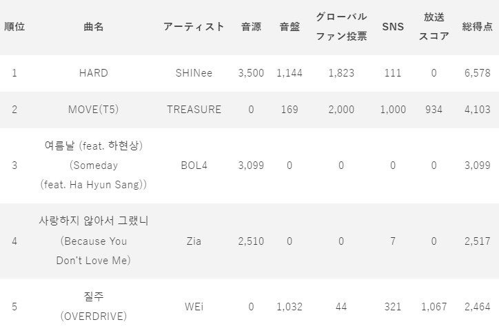 - 7月12日の放送回でSHINeeのHARDが総得点で1位となり、チャンピオンソングとして放送
