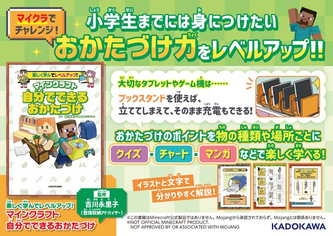 株式会社KADOKAWAは、大人気ゲーム『マインクラフト』のキャラクターを用いた、子ども向けのおかたづけ学習本『楽しく学んでレベルアップ!マインクラフト 自分でできるおかたづけ』を2025年3月12日に発売しました。