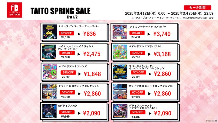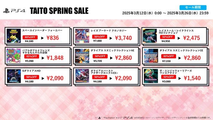 - タイトーのスプリングセールでNintendo Switch、PS4向けダウンロード版ソフトが最大80%オフ