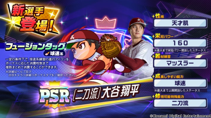 二刀流として登場する大谷選手は、新ボーナスフュージョンタッグ「球速系」と特殊能力「二刀流」を所持。