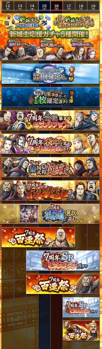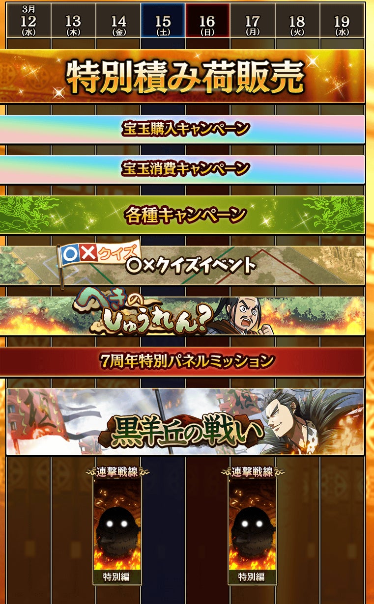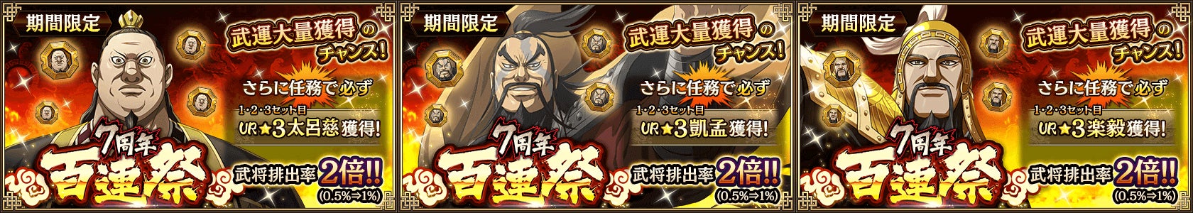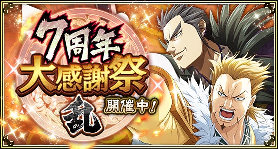 同時に7周年記念イベント『7周年大感謝祭-乱-』第4弾が開催中で、UR武将確定ガチャや、特定武将強化に特化したパック販売などが行われている。