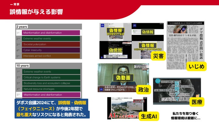 世界経済フォーラムが「世界で最も懸念される脅威」に挙げた偽情報問題への対策として、特に近年増加しているAI生成によるディープフェイクへの対策として注目されています。