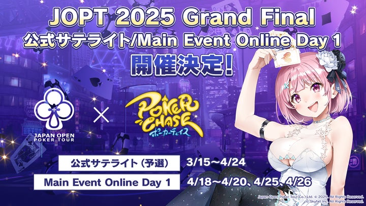オンラインポーカーゲーム『ポーカーチェイス』で、国内最大規模のポーカーイベント「JOPT 2025 Grand Final」の公式サテライト(予選)と本選(Online Day 1)が、2025年3月15日~4月26日に開催されます。