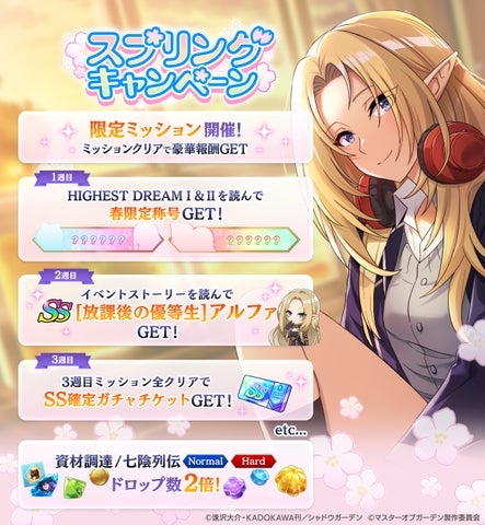 株式会社KADOKAWAと株式会社Aimingは、スマホゲーム『陰の実力者になりたくて!マスターオブガーデン』(カゲマス)でスプリングキャンペーンを開催します。