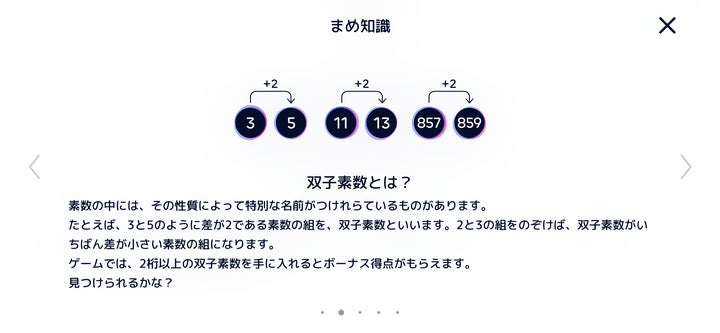 素数コレクションや素数に関する豆知識も備えており、遊びながら素数の知識を深められます。