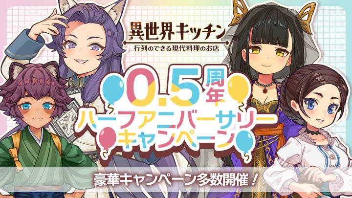 スマホゲーム『異世界キッチン 行列のできる現代料理のお店』がリリース0.5周年を迎え、3月5日から様々なアニバーサリーキャンペーンが開催されます。