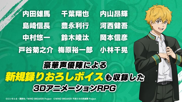 ウィンヒロは、TVアニメ『WIND BREAKER』を題材とした3DアニメーションRPGで、スマートフォン、Windows、Steamでプレイ可能です。