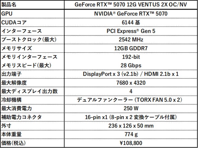 - GeForce RTX™ 5070搭載グラフィックカード「GeForce RTX™ 5070 12G VENTUS 2X OC/NV」発売