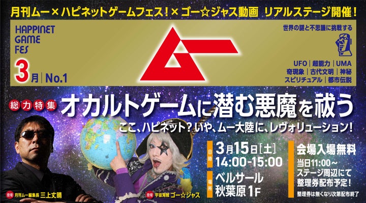 3月15日(土)開催の「ハピネットゲームフェス!」では、『FAITH』の試遊体験や、『ムー』とのコラボ企画として、三上丈晴編集長登壇のステージイベントが実施されます。