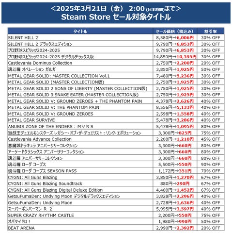 - KONAMIのSpring SALE開催中(PlayStation Store、ニンテンドーeショップ、Steam Store)