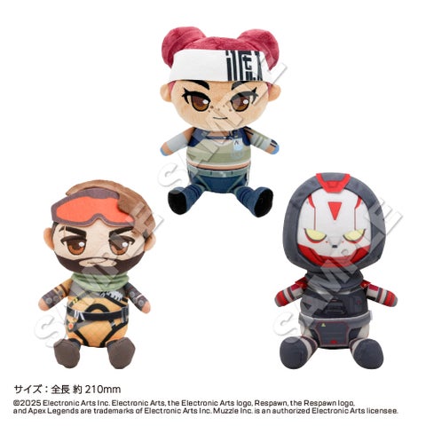 ラインナップには、お座りぬいぐるみマスコット(ライフライン、ミラージュ、レヴナント)、お手のりネッシー、オクタンフーディー、クリアボトル、トラベルステッカー、トレーディングマグネットなどがあります。