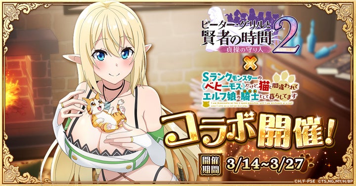 スマホゲーム『ピーター・グリルと賢者の時間 貞操の守り人2』で、TVアニメ『Sランクモンスターの《ベヒーモス》だけど、猫と間違われてエルフ娘の騎士(ペット)として暮らしてます』(ベヒ猫)とのコラボイベントが2025年3月14日から3月27日まで開催されます。