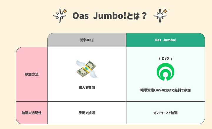 - Oas Jumbo!はOASロックによる無料参加型NFTくじサービスで、ブロックチェーンによる透明性確保