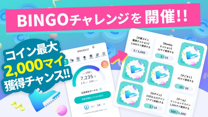 株式会社Agoopは、歩数でコインを獲得できるスマホアプリ「アルコイン」において、ビンゴゲーム形式のキャンペーン「BINGOチャレンジ」を2025年3月17日から4月16日まで開催します。