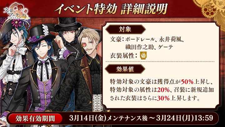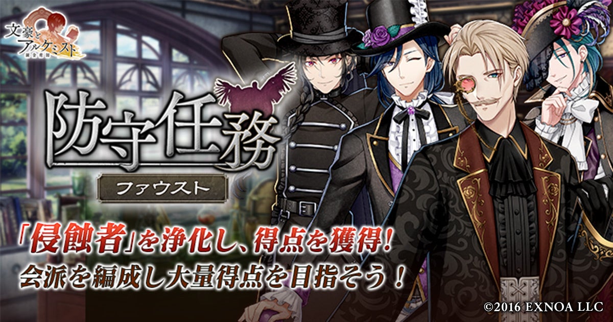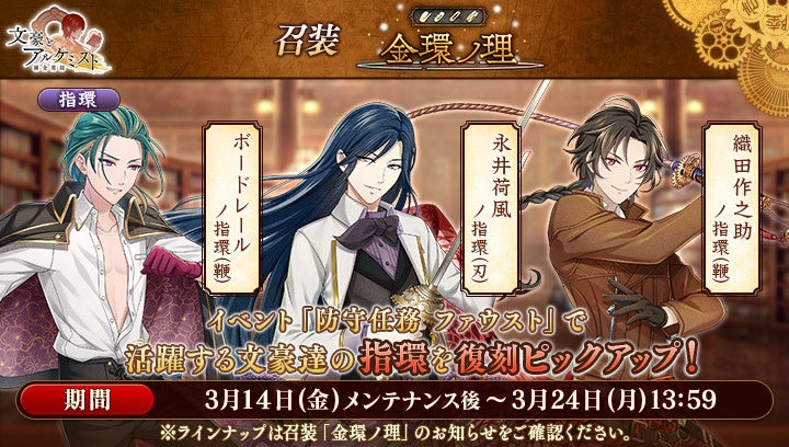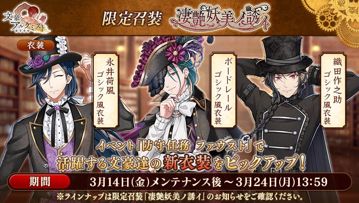 DMM GAMESの女性向け文豪転生シミュレーションゲーム『文豪とアルケミスト』にて、3月14日(金)よりイベント『防守任務「ファウスト」』と限定召装『凄艶妖美ノ誘イ』が開催されました。