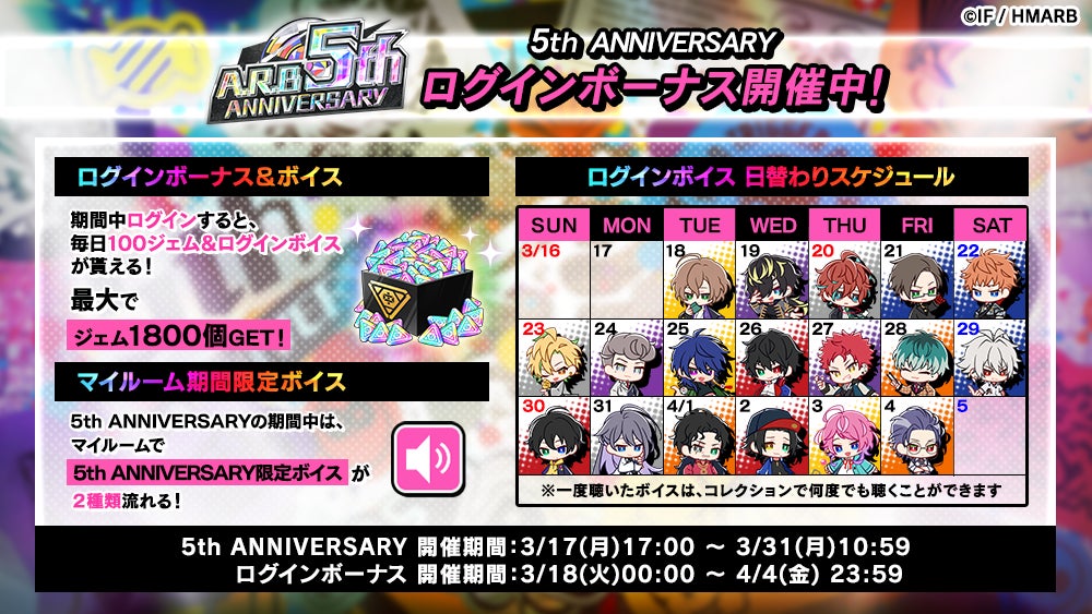 キャンペーン期間中は、イベント「5th ANNIVERSARY」、新登場の「Anniv. Rap Board」、ログインボーナス、限定ミッションなど、様々な企画が用意されている。