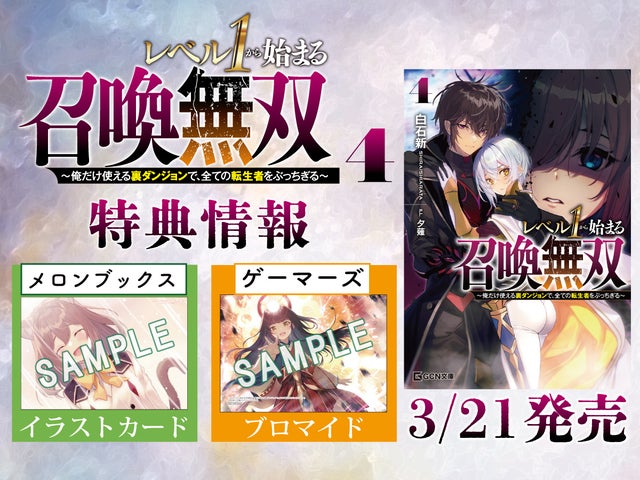 - GCN文庫『レベル1から始まる召喚無双~俺だけ使える裏ダンジョンで、全ての転生者をぶっちぎる~ 4』が2025年3月21日発売