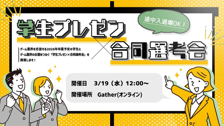 株式会社ゲームクリエイターズギルドは、2026年以降に卒業予定のゲーム業界志望の学生向けに、3月19日(水)12:00~19:00、オンライン合同企業説明会「学生プレゼン×合同選考会」を開催します。