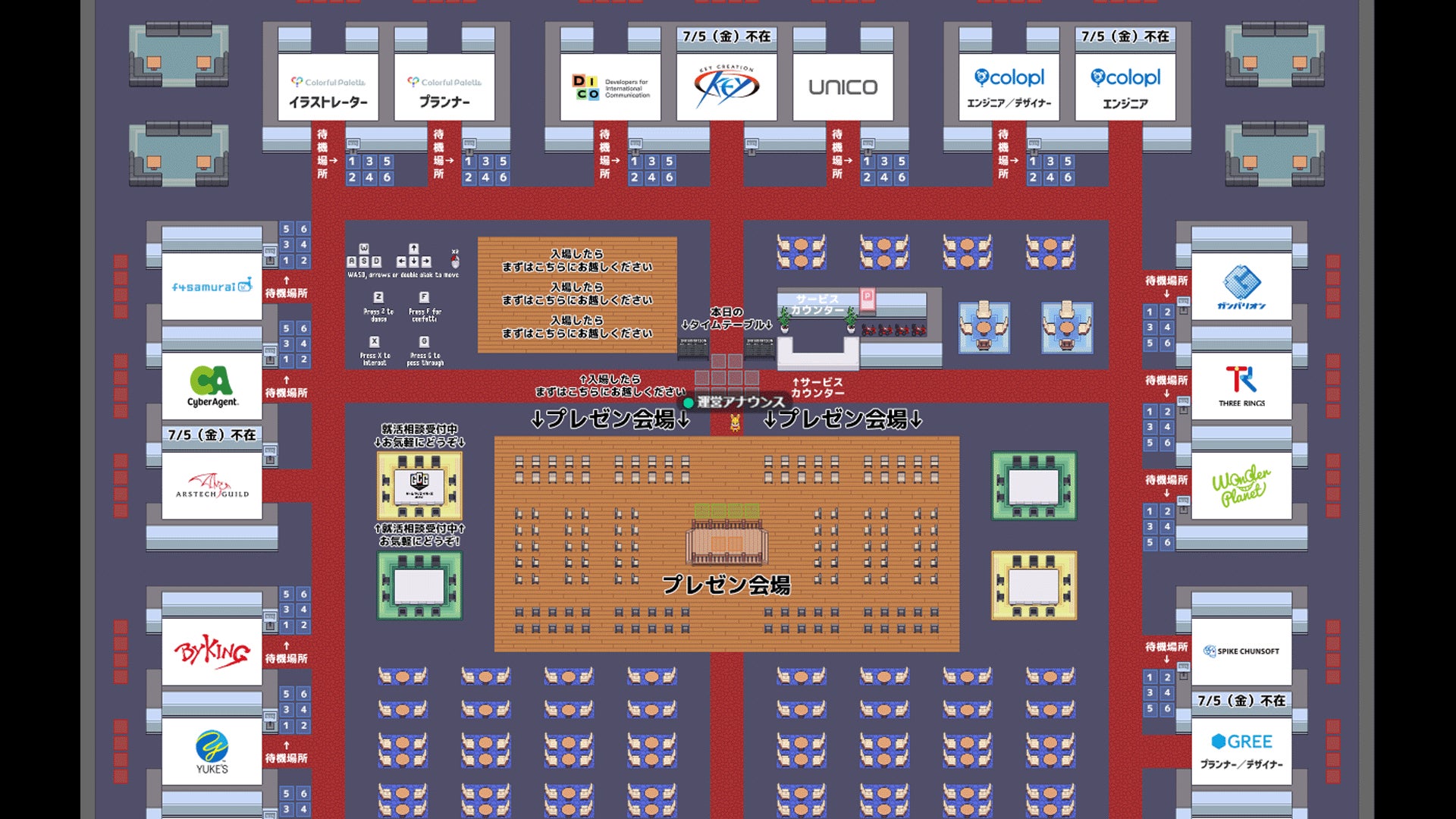 - 20社以上のゲーム企業が参加し、会社説明、個別相談、学生プレゼン、逆オファーなどを行う