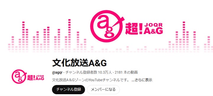 YouTubeチャンネル『文化放送A&Gチャンネル』も登録者10万人を突破し、アーカイブ配信などを展開しています。