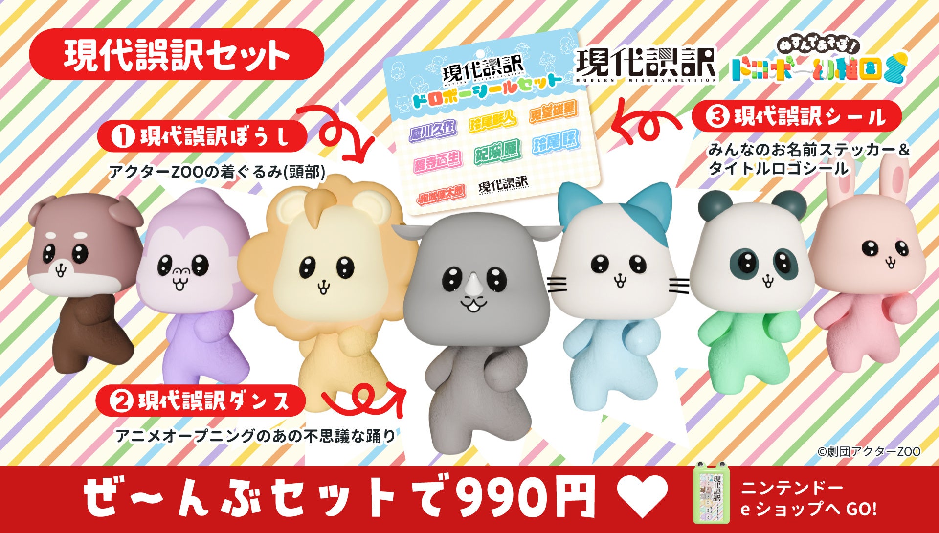 コラボアイテムは「現代誤訳セット」として990円で販売され、帽子7種、現代誤訳ダンス、お名前シールが含まれています。