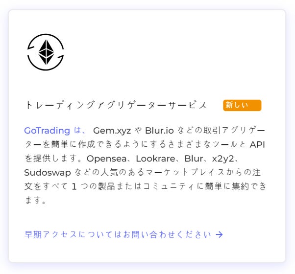 今回新しく開発されたのは、『GoWidget』『Sweeps』『トレーディングアグリゲーターAPI』の3種類です。