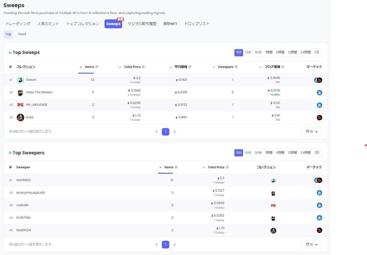 【Sweepstにアクセス:https://nftgo.io/ja/discover/sweeps/top】