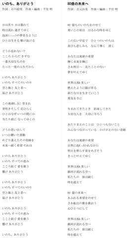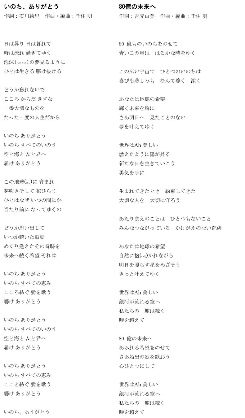 - 作曲:千住明、歌唱:平原綾香『いのち、ありがとう/80億の未来へ』
