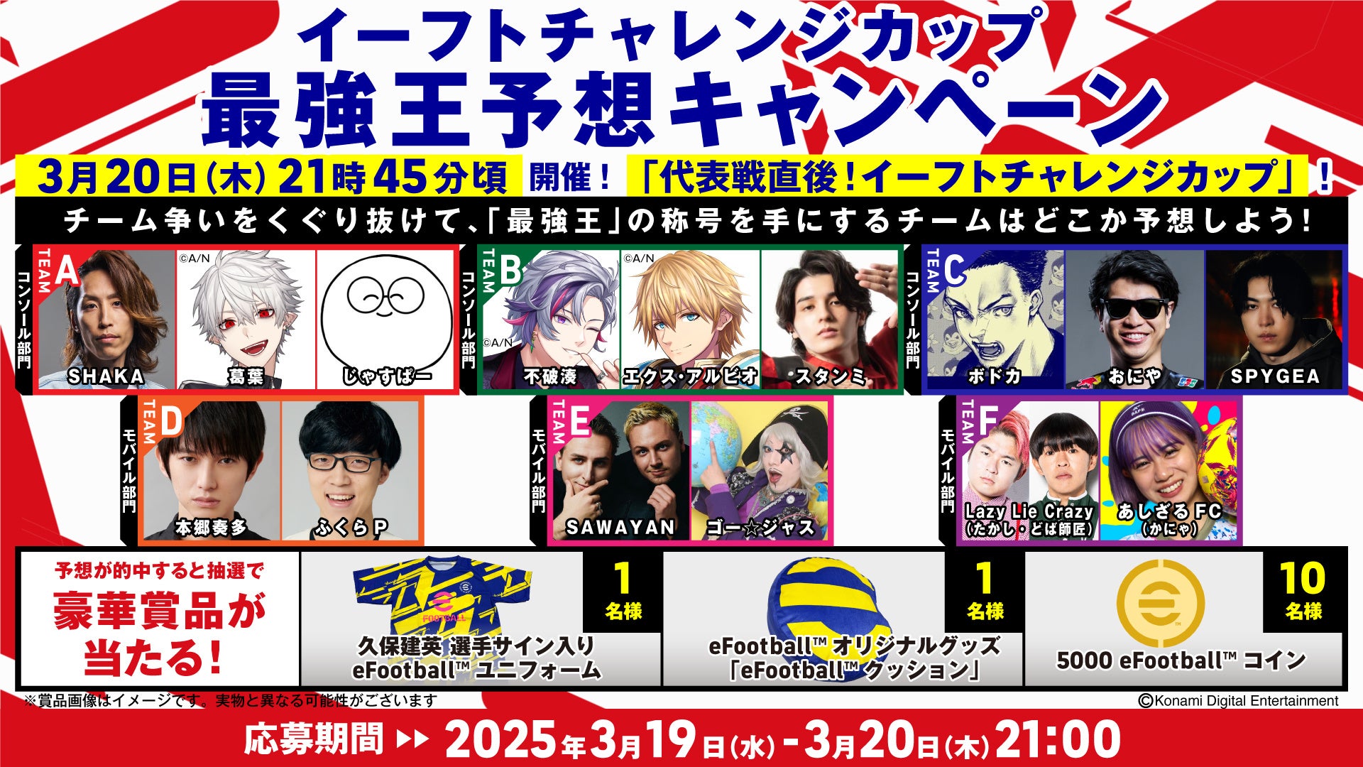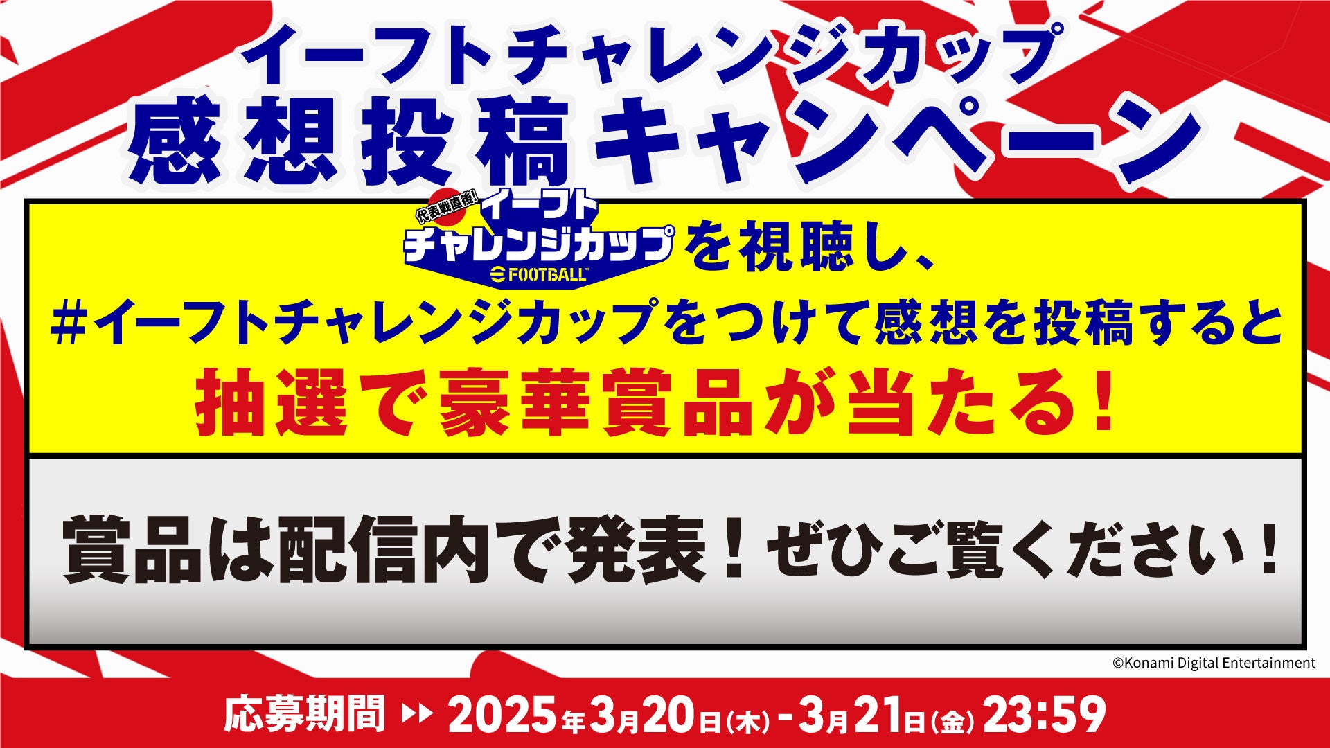 KONAMIは、3月20日(木)21時45分から『eFootball™』のスペシャル生配信「代表戦直後!イーフトチャレンジカップ」を実施します。