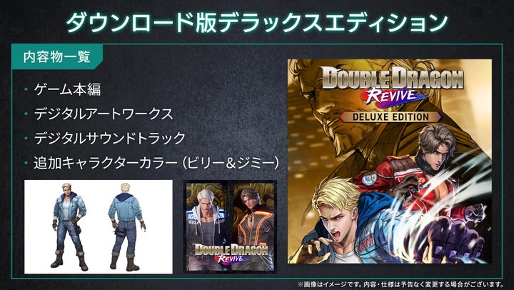 また、『ダブルドラゴン リヴァイヴ』のデラックスエディションには、追加キャラクターカラー、デジタルアートワークス、デジタルサウンドトラックが同梱されます。