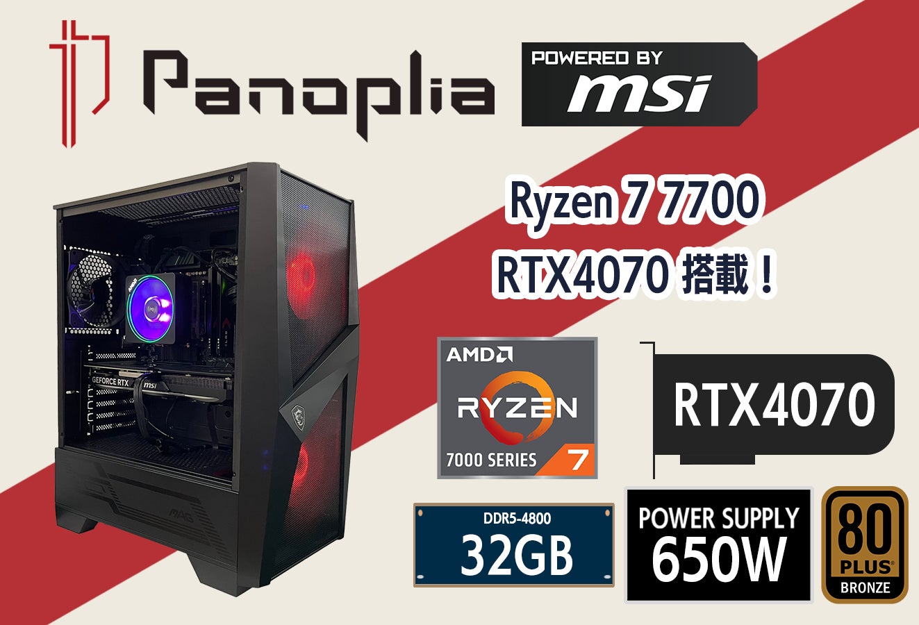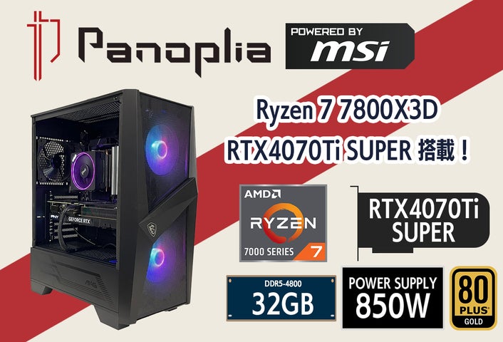 新製品は、高性能グラフィックボードGeForce RTX 4070搭載の「Panoplia Powered by msi R7B654070PM2」と、GeForce RTX 4070 Ti SUPER搭載の「Panoplia Powered by msi R7B6547TSPM3D」の2機種です。