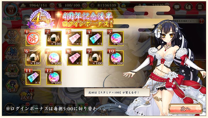 - リリース4周年記念キャンペーンとして、姫晶石3000個配布、カムバックキャンペーン、スタミナ消費半減キャンペーンなど多数開催中