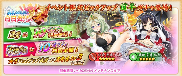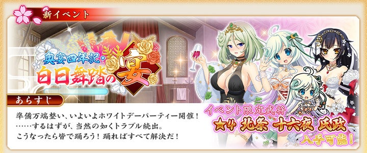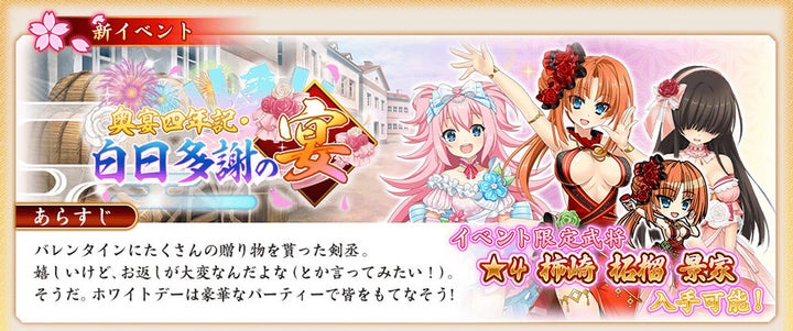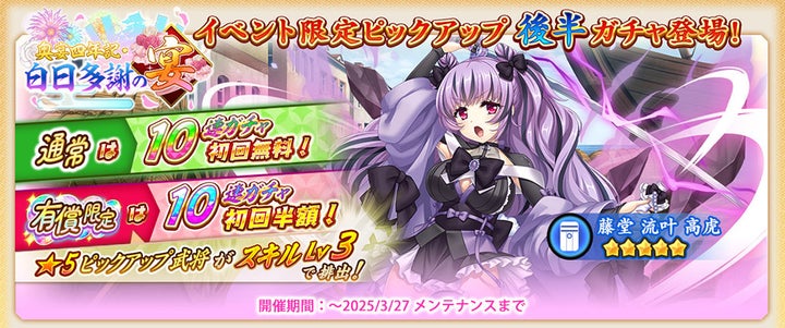 イベント限定武将の獲得や、お得なガチャキャンペーンも実施しており、新キャラクター『★5 [迷い兎]流叶』、『★5 [瑞兆四周年]朔夜』、『★5 [瑞兆四周年]久遠』が登場します。