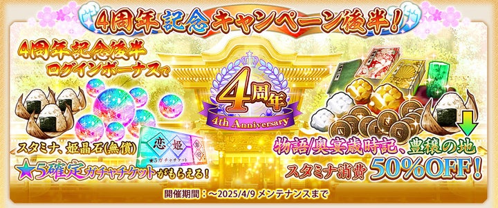さらに、スタミナ消費半減や毎日ログインボーナス、4周年記念イベント第1弾・第2弾を開催。