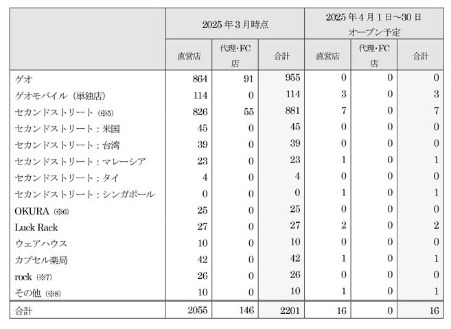 - ゲオ、ゲオモバイル、セカンドストリートなど複数の業態が含まれる