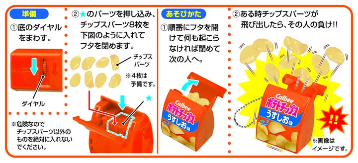 このゲームは、本体にチップスパーツを入れ、フタを開けてチップスパーツが飛び出したら負けという運試しゲームです。