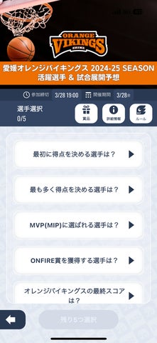 予想内容は、最初に得点を決める選手、最多得点選手、MVP(MIP)、ONFIRE賞、オレンジバイキングスの最終スコアなどです。