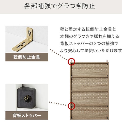 耐荷重10kgの棚板と、転倒防止金具、背板ストッパーで安全性を高めています。