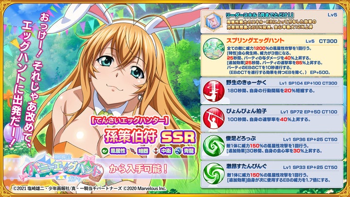 このイベントでは、新キャラクター「【てんさいエッグハンター】孫策伯符」(CV: 浅野真澄)が登場する「バニーエッグハントガチャVol.1」や、イベント限定SRキャラ「【かしこい子ウサギ】諸葛亮孔明」を獲得できるイベントが開催されています。
