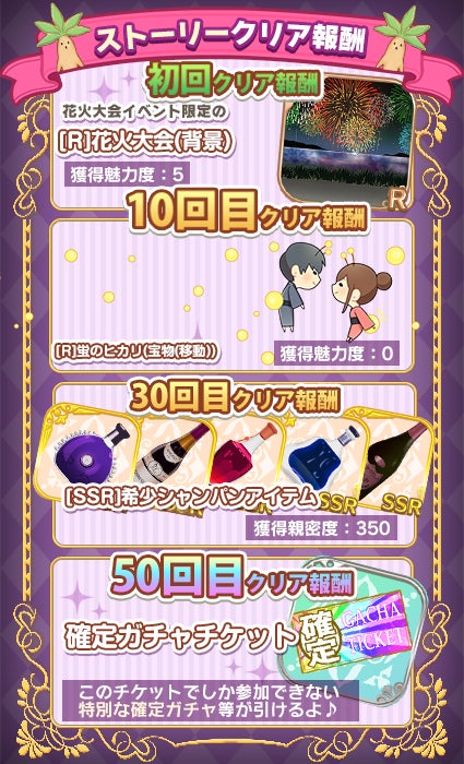 さらに、デート回数に応じて豪華報酬がもらえるだけでなく、花火大会イベント限定の彼フェスも開催されます。