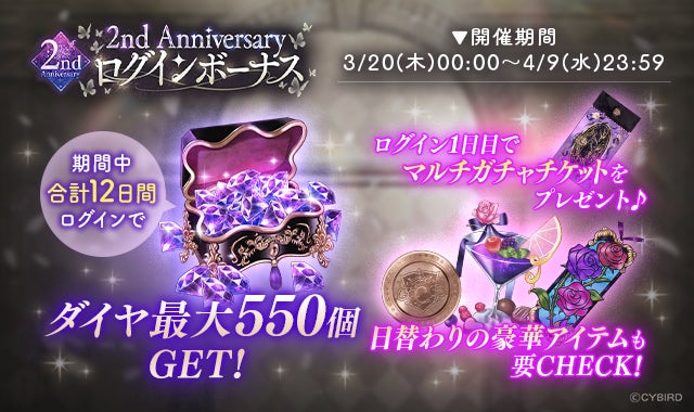 女性向け恋愛ゲーム『イケメンヴィラン 闇夜にひらく悪の恋』がサービス開始2周年を迎え、様々なアニバーサリーキャンペーンが展開されています。