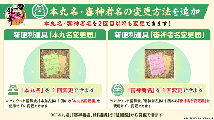 さらに、本丸名・審神者名の変更機能や、月額サービス「本丸刀剣保存会」が開始され、出陣自動周回や各種上限拡張などの特典が提供されます。