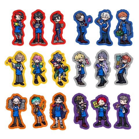 ヴィレッジヴァンガードのスタッフエプロンを着たヒプマイキャラクターのミニキャラアートを使用した、アクリル時計、トートバッグ、缶バッジ、キャラクタースタンド、トレーディングステッカー、クリアカード、アクリルキーホルダー、アクリルバッジ、クリアファイルなど、多様なアイテムがラインナップされています。