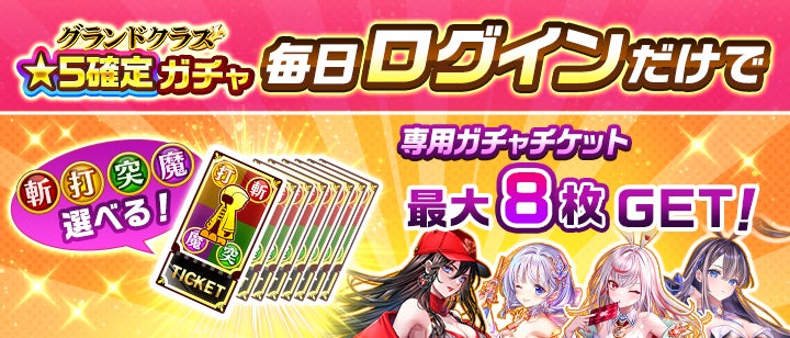 - ログインボーナスで「選べる!グランドクラス★5確定キャラガチャチケット」最大8枚獲得可能